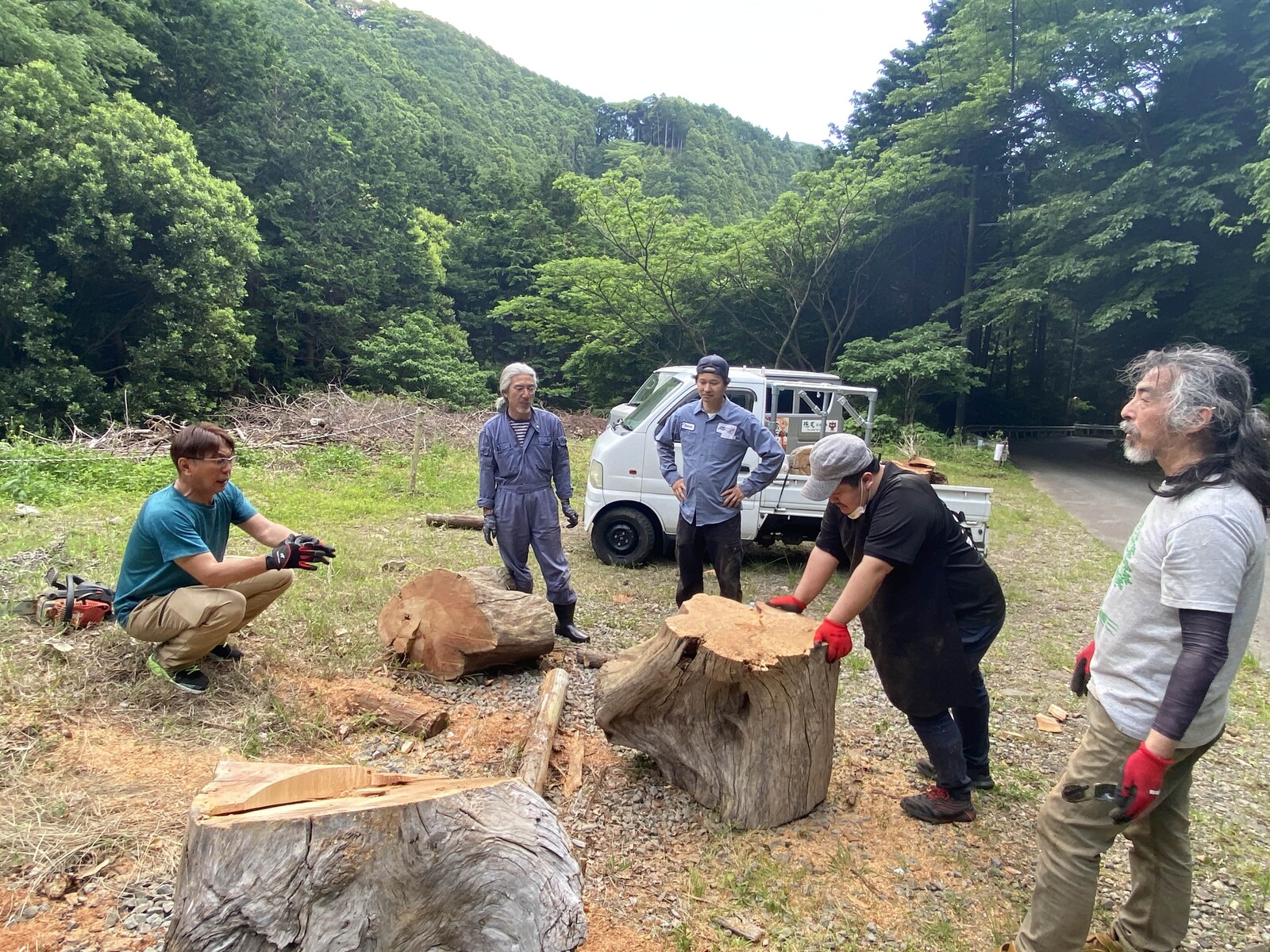 さっそく行ってみると、なにやらワイルドな集団が大きな切り株を囲んでいます。