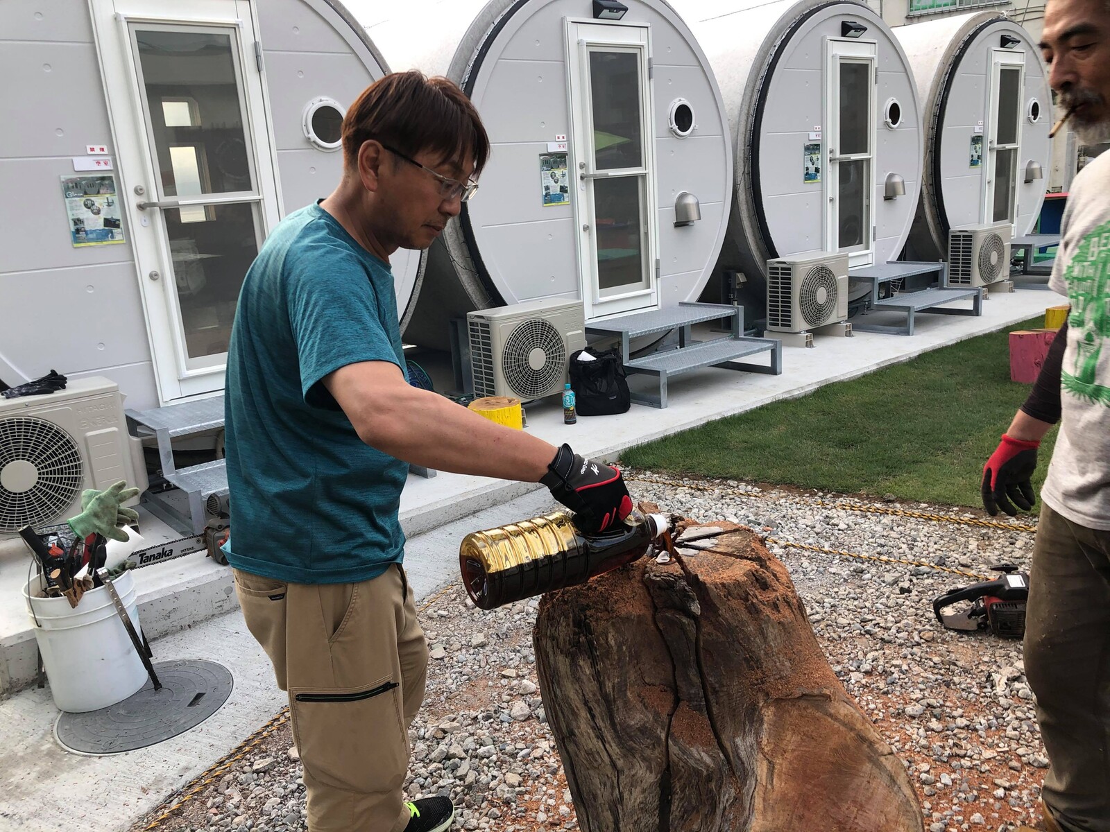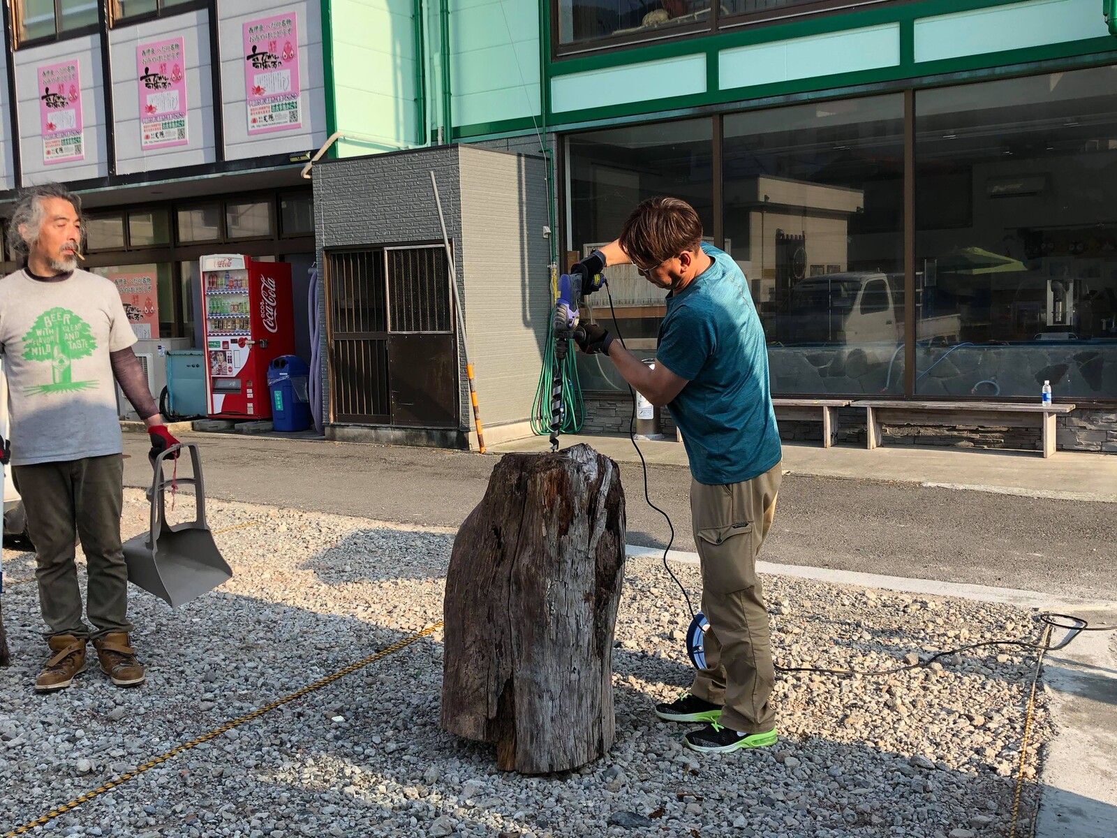 到着するやいなや、電動ドリルで真ん中に穴を開け始めました。