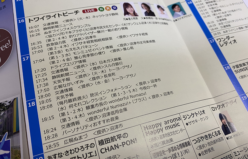 コーストエフエムは76.7Mhz。視聴可能エリアは、沼津市、三島市、清水町に長泉町、函南町。そして静岡市、富士市、裾野市と伊豆の国市の一部です。意外と遠くまで沼津の情報が届くんですねー。番組表にはまゆみん@ぬまつーも載ってる。